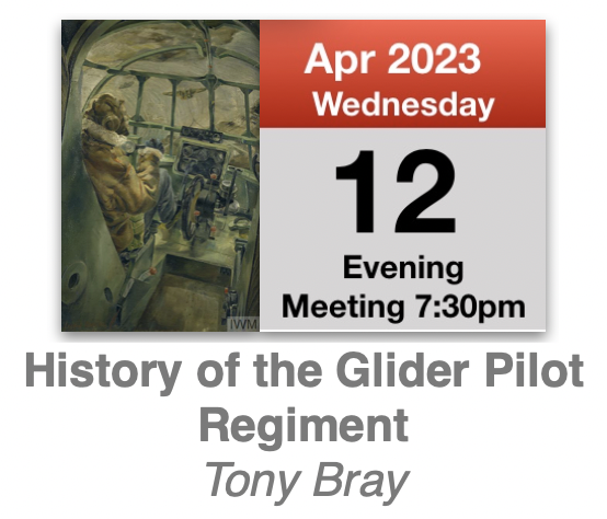 Tony Bray’s talk starts with a short background outlining how the airborne forces, both parachute and glider-borne, were developed in 1940. He will introduce the four main military gliders used by the Allies – from doing glider conversion training in the Hotspur, to the massive tank-carrying Hamilcar and also explain how the future pilots of the Glider Pilot Regiment were selected and trained.