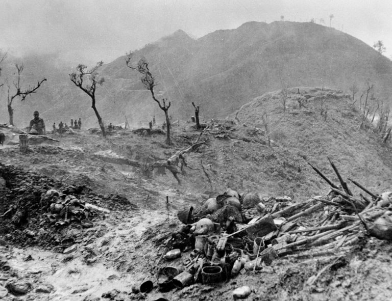 ‘Scraggy’ was the British nickname for one of the hills of the 5,000 foot-high Shenam Saddle which was the scene of intense fighting during the Japanese drive along the Patel road towards Imphal in April 1944. The position was a labyrinth of bunkers; trees were reduced to shattered trunks and the hillsides turned into barren wastes by artillery fire. The result was a field of battle reminiscent of the worst fighting on the Somme during World War One.