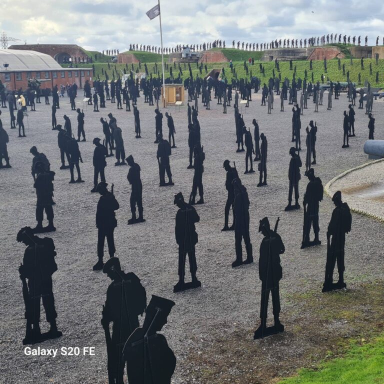 A bitter chill wind swept in across the Solent and greeted us as we pulled up into the Fort Nelson car park. Above us the giant fortress, built in 1860 to protect against a possible French invasion, gave a certain irony to our visit. An irony in that the 1475 silhouette soldiers, sailors, airmen and others who 80 years ago had given their lives on 6th June 1944 to ‘invade’ but better described to liberate Nazi occupied Europe from years of repressive tyranny.